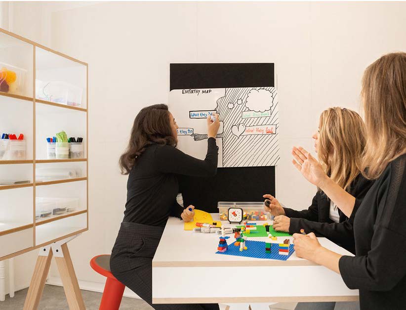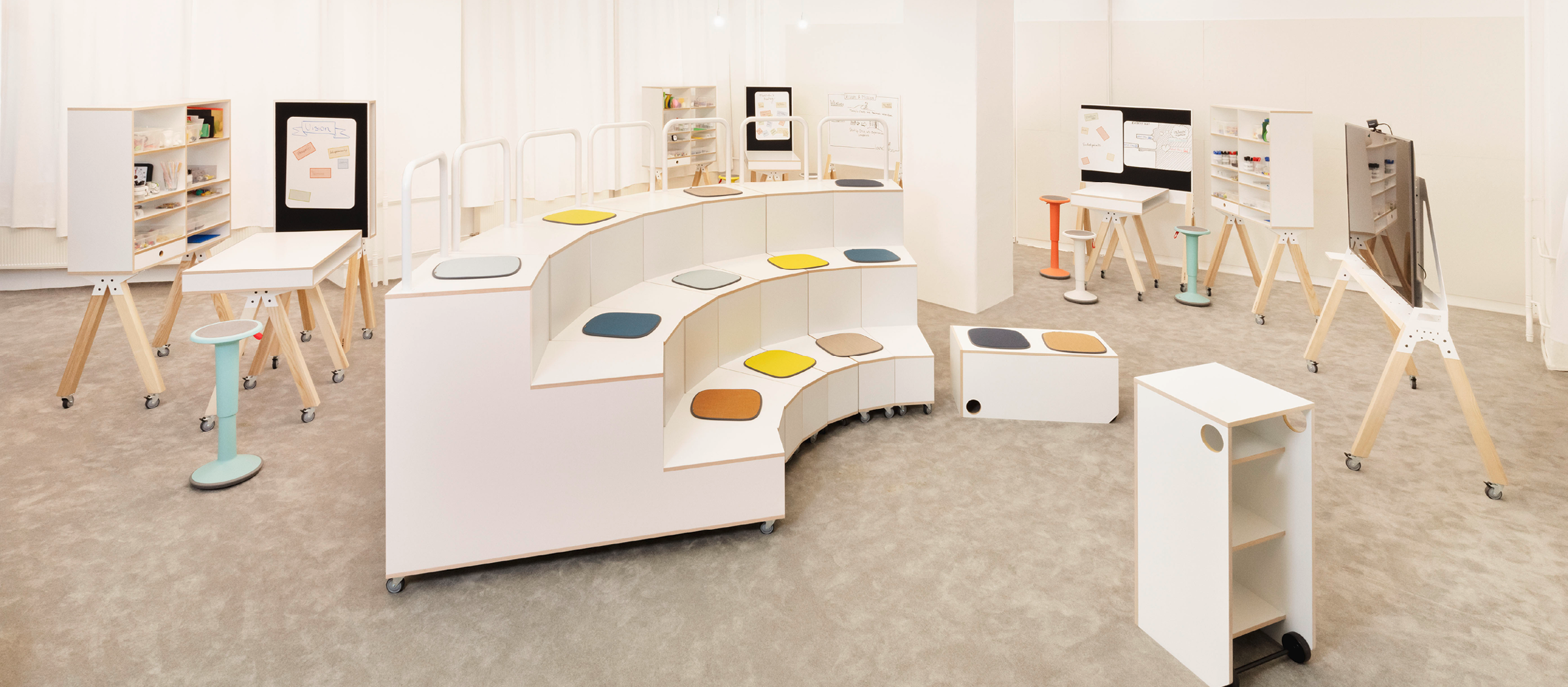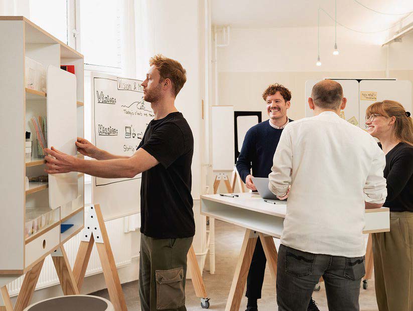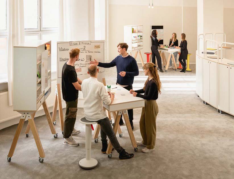 Räume und Möbel, die sich situativ anpassen (tragbare Whiteboards, mobile Arbeitstische, Design Thinking Regale).