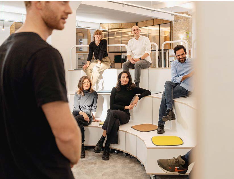 Tribünenelemente für Gruppenpräsentationen, verschiedene Arbeitszonen für fokussiertes Arbeiten, Austausch und Regeneration.